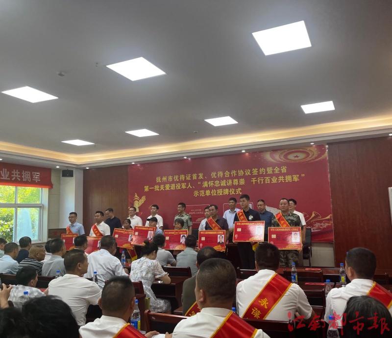 江南都市報訊 揭賓耀 全媒體記者舒曉燕攝影報道:9日上午,撫州市優待證首發、優待合作協儀簽約暨第一批關愛退役軍人示范單位授牌儀式活動舉行,為全省首批4家“滿懷忠誠講尊崇 千行百業共擁軍”示范單位,2家省級關愛退役軍人示范單位授牌,為退役軍人和其他優撫對象代表發放優待證。撫州市文廣新旅局、撫州市教育體育局等12家優待合作單位簽訂優待項目協議。