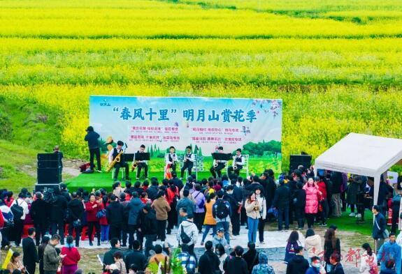 油菜花田里人流如織,千畝油菜花競相綻放,花海中的舞臺,上演著精彩的歌舞節目,樂隊、舞蹈、古箏輪番上臺,讓在場觀眾看得目不轉睛,紛紛拿出手機記錄精彩瞬間,博得了大家一陣又一陣的掌聲。活動現場還準備了花海音樂會、漢服巡游、花海寫生、花海攝影、花海火鍋等活動,以豐富的旅游體驗,讓游客既飽“眼福”,又飽“口福”,真正參與到賞花活動之中。
