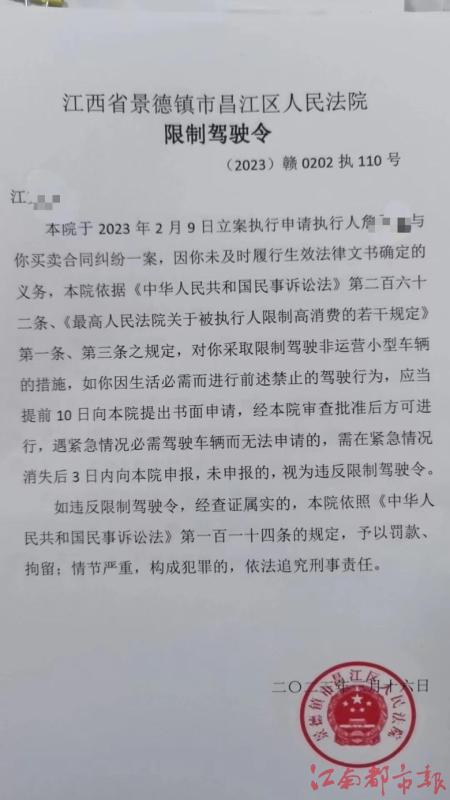 江南都市報(bào)訊 方劍、全媒體記者余文斌攝影報(bào)道:3月27日,記者從景德鎮(zhèn)市昌江區(qū)人民法院獲悉,該院于近日向江某某發(fā)出了該市首份“限駕令”,通過(guò)限制其駕駛非運(yùn)營(yíng)性小型車輛的措施,達(dá)到有力打擊“老賴”,保障其他當(dāng)事人合法權(quán)益的目的。