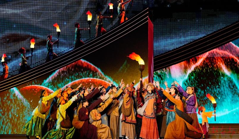 開門迎客的序章上,以龍舟鼓舞與情景講述《客從何來》,是對客家淵源的探索,更是全球客家人山水相依的結緣。開篇的客途為家,以光影音畫表演 、情景演唱以及非遺情景儀式表演《遷徙南渡》《圍屋之歌》《安家喜釀》時光瞬間被拉回至千年前,客家人的歷史徐徐展開。隨著時空轉換,巨幕上的圍屋連接古今,講述著客家人遷徙的歷史。客家文化流淌千年,圍屋燈火映照古今,客家山歌唱著綠水青山與金山銀山的故事,就此安居樂業。