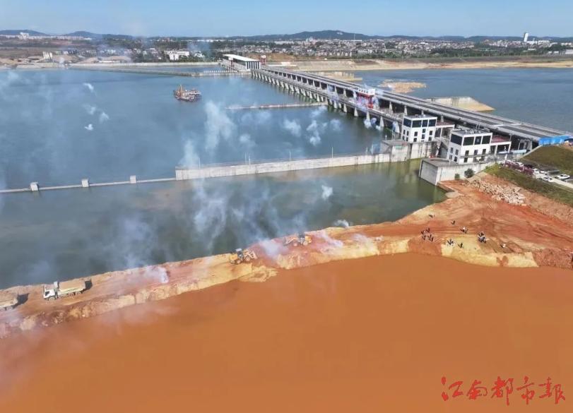 江南都市報訊 鄔晶鑫、王春、全媒體記者章娜攝影報道:11月8日,記者從省港口集團獲悉,6日10點16分,伴隨著砂石料翻滾而下的入水聲,贛江龍頭山樞紐二線船閘工程迎來了重大時刻——上游圍堰成功合龍,這標志著贛江龍頭山樞紐二線船閘工程進入了主體施工的關鍵階段。