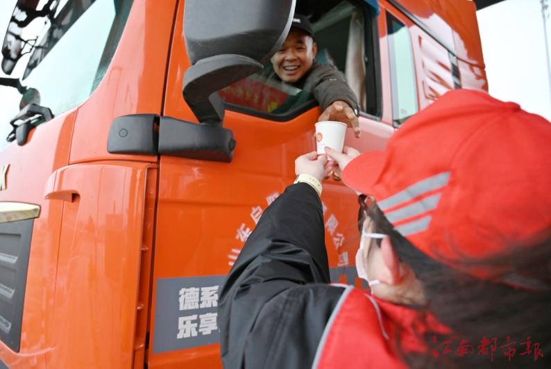 “這里是山區高速,入冬后大清早氣溫有點低,而且風又大,喝完你們的姜茶,身上暖和了,心里也暖暖的。”當司乘喝上暖暖的姜茶,都豎起了大拇指,特別是貨車司機,經過一晚的長途跋涉,在外廣場暫時休息時,喝上一杯濃濃的紅糖姜茶,直呼消除了一身疲憊,身心愉悅。