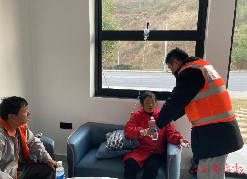為幫助受傷的群眾爭取救治時間,該站值班人員第一時間帶受傷婦女到就近的衛生院進行簡易的處理,對傷口進行止血、包扎等。處理完之后,立即把受傷群眾帶回會昌北收費站“欲曉驛站”等待救護車到來。此時正值午飯,該站值班人員端上了熱乎乎的飯菜,為受傷群眾補充能量。5分鐘后,救護車及時趕到,該站開啟了救護專用通道加快救護車輛通行。