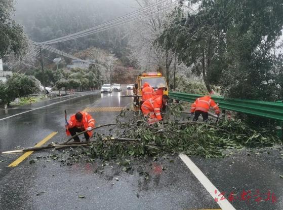 “巡查發(fā)現(xiàn)G319國(guó)道K1091至1206有多棵樹(shù)木倒伏,請(qǐng)速來(lái)支援!”5日晚上7時(shí),伴隨著一陣急促的電話報(bào)告后,該市湘東公路中心迅速啟動(dòng)惡劣天氣應(yīng)急預(yù)案,開(kāi)展路面清障工作,源并道班人員立即在該路段擺放安全警示標(biāo)志,并疏導(dǎo)車輛。樹(shù)木上已經(jīng)結(jié)了1~2厘米厚的冰凌,道班人員只能交替使用油鋸、鐮刀,將倒伏的樹(shù)干、樹(shù)枝砍斷再轉(zhuǎn)移。經(jīng)過(guò)當(dāng)晚4個(gè)多小時(shí)的緊張?zhí)幹茫狗诼飞系臉?shù)木全部被清除,該路段恢復(fù)正常通行。該中心共出動(dòng)巡查、養(yǎng)護(hù)人員57人、養(yǎng)護(hù)車7輛,人工、機(jī)械撒布融雪劑約1噸,清理倒伏樹(shù)木350余棵。