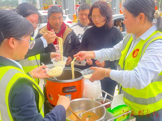 2月17日8時(shí)起,受春運(yùn)返程高峰影響,龍南西收費(fèi)站外廣場(chǎng)陸續(xù)有車輛聚集,并且短時(shí)間快速增多,工作人員立刻投入保暢工作。當(dāng)了解到很多司乘都是連夜趕車,沒有吃早飯,工作人員便為司乘免費(fèi)提供面條和燙皮等食物。“我們是從湖南趕回廣州的,因?yàn)楦咚偕宪囕v太多臨時(shí)在龍南西收費(fèi)站下高速,沒想到在這還能吃到免費(fèi)的面條,江西老表很熱情,給你們點(diǎn)贊”,司機(jī)謝師傅笑著說(shuō)道。據(jù)悉,當(dāng)天龍南西收費(fèi)站為150余人次司乘人員免費(fèi)提供食物充饑,同時(shí)還護(hù)送了兩名病人到醫(yī)院就醫(yī),一系列暖心頭的事讓司乘朋友的返程旅途更有溫度。