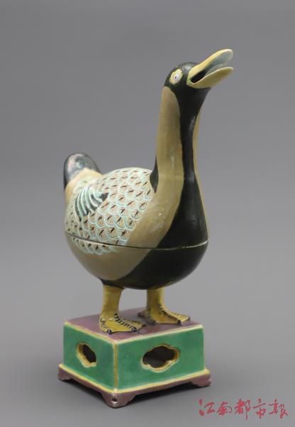 御窯博物院黨支部書記鄒媛告訴記者,“素三彩鴨形香薰的‘素’就是沒有紅色這種‘葷’色,但‘素顏’的它可不止黃綠紫三彩,層次很細膩,僅黃色就有嬌黃和土黃兩種,像銀杏葉一樣的翅羽上還涂有孔雀藍,眼睛很特別,是個大花眼,總是昂著小腦袋,文物原型中還俏皮地吐著小舌頭。觀眾們對它特別喜愛,覺得這只小‘素’鴨是只內涵鴨、達觀鴨,有大‘紅’之相。”