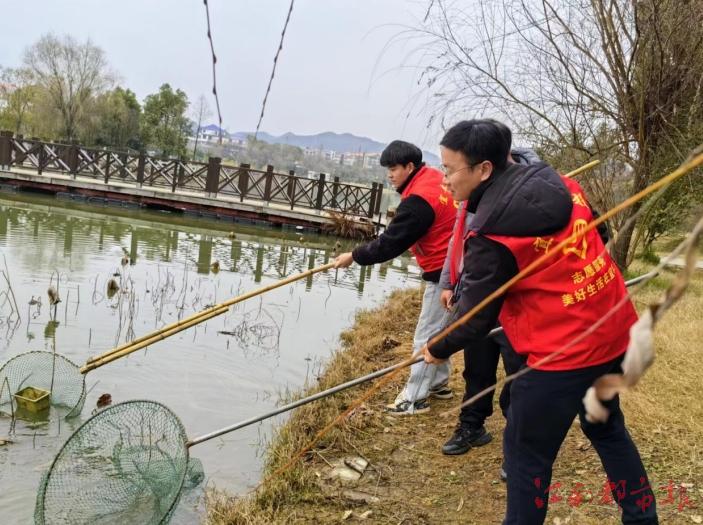 志愿者們身穿志愿者服裝,準時來到新昌濕地公園,簡單分工布置后,大家立即開始忙碌起來。垃圾清理組伸出長長的網兜,正打撈公園人工湖湖面白色垃圾和浮游物品。