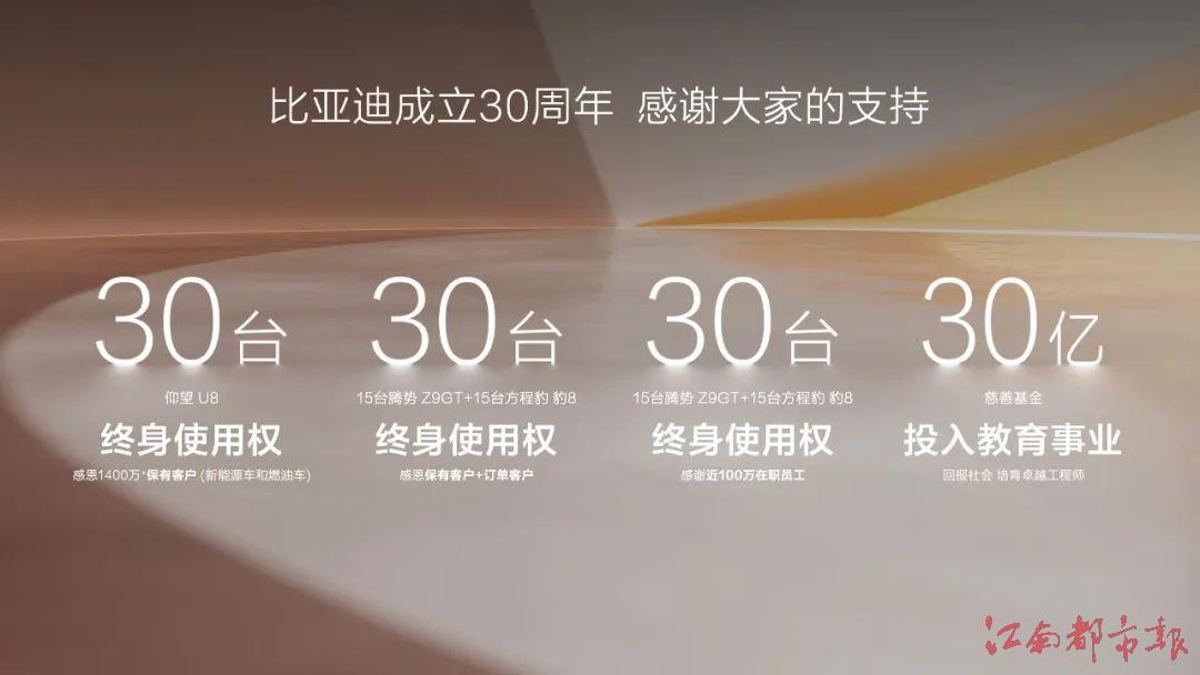 比亞迪如今的成績,離不開社會各界的關注與支持。王傳福以4個“30”回饋社會、車主和員工,真誠感謝一路同行的伙伴。