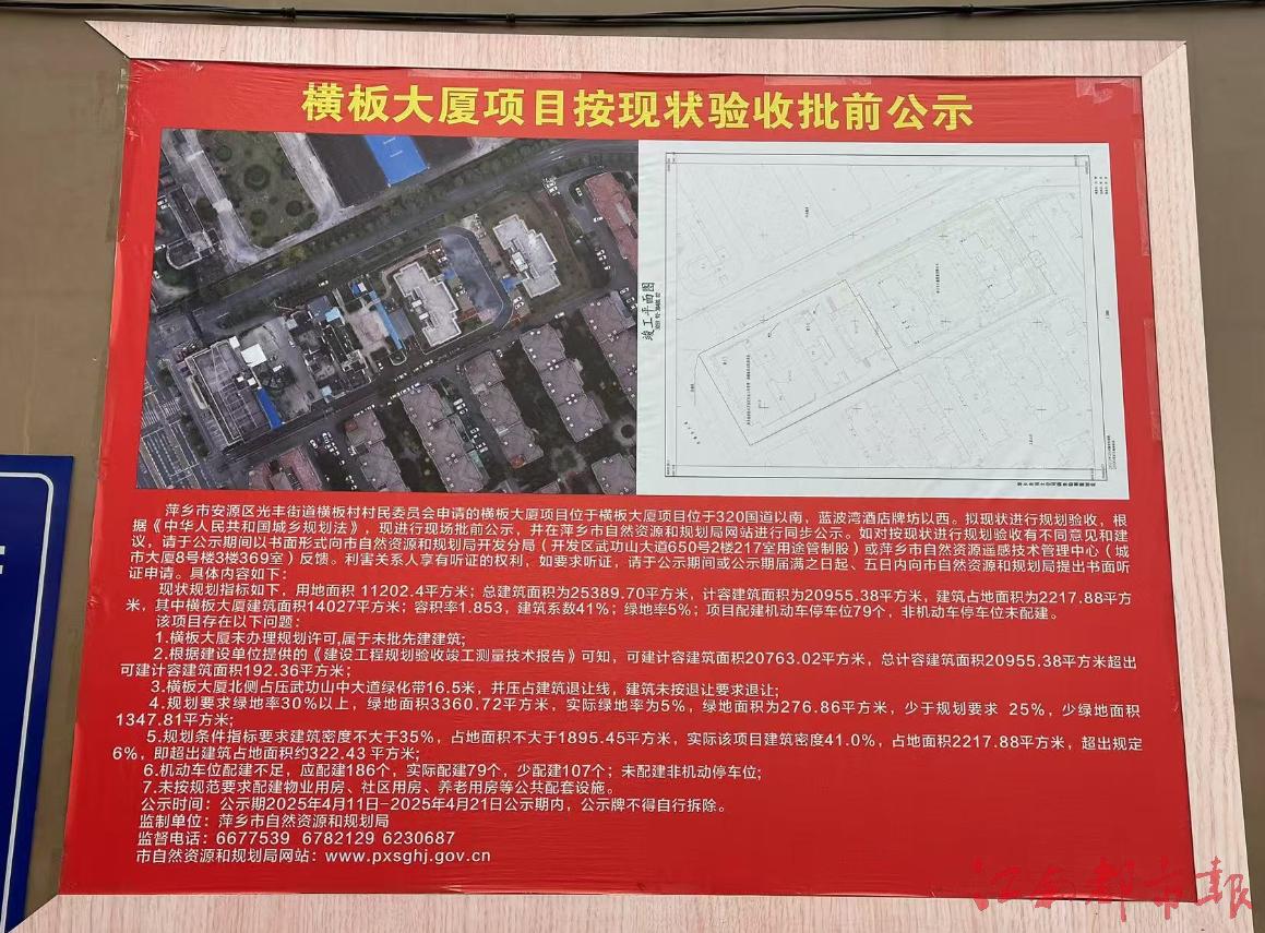 今年4月,萍鄉市自然資源和規劃局一則關于“橫板大廈項目按現狀驗收”的公示說明,引發關注。這棟位于萍鄉經開區光豐街道橫板村的大廈,2015年7月竣工,如今欲通過“按現狀驗收”的方式“轉正”,引發公眾質疑。